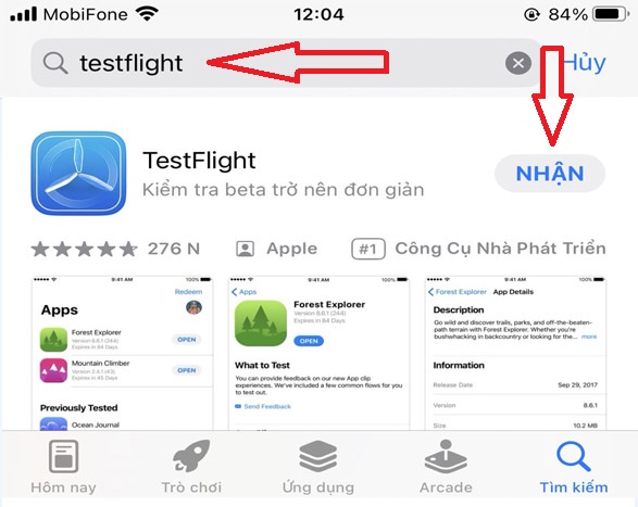 - Bước 1: Truy cập app store trên thiết bị Iphone của bạn sau đó vào mục tìm kiếm gõ từ khóa "testflight" sau đó tiến hành tải ứng dụng "testflight" về máy điện thoại của bạn.
